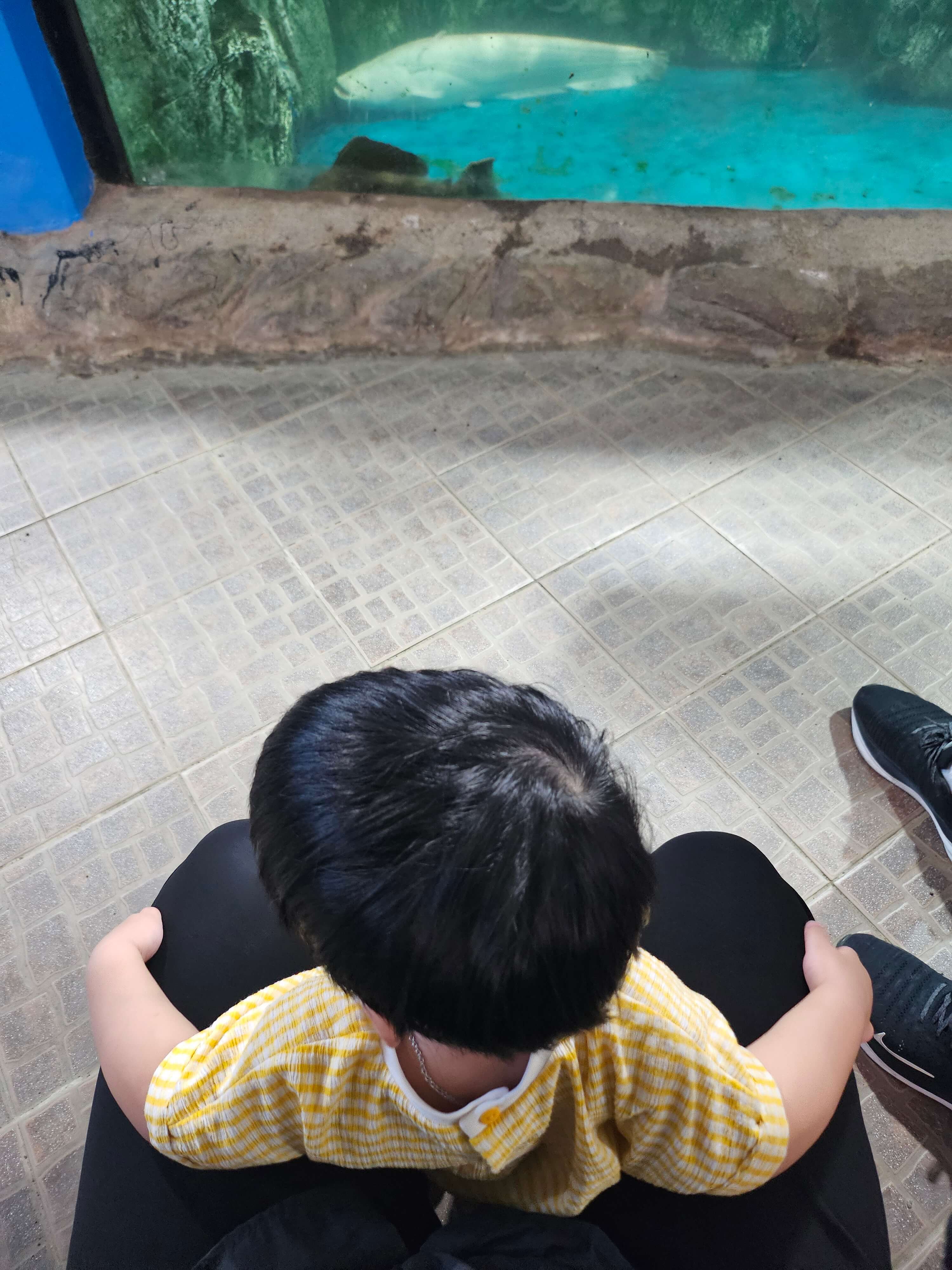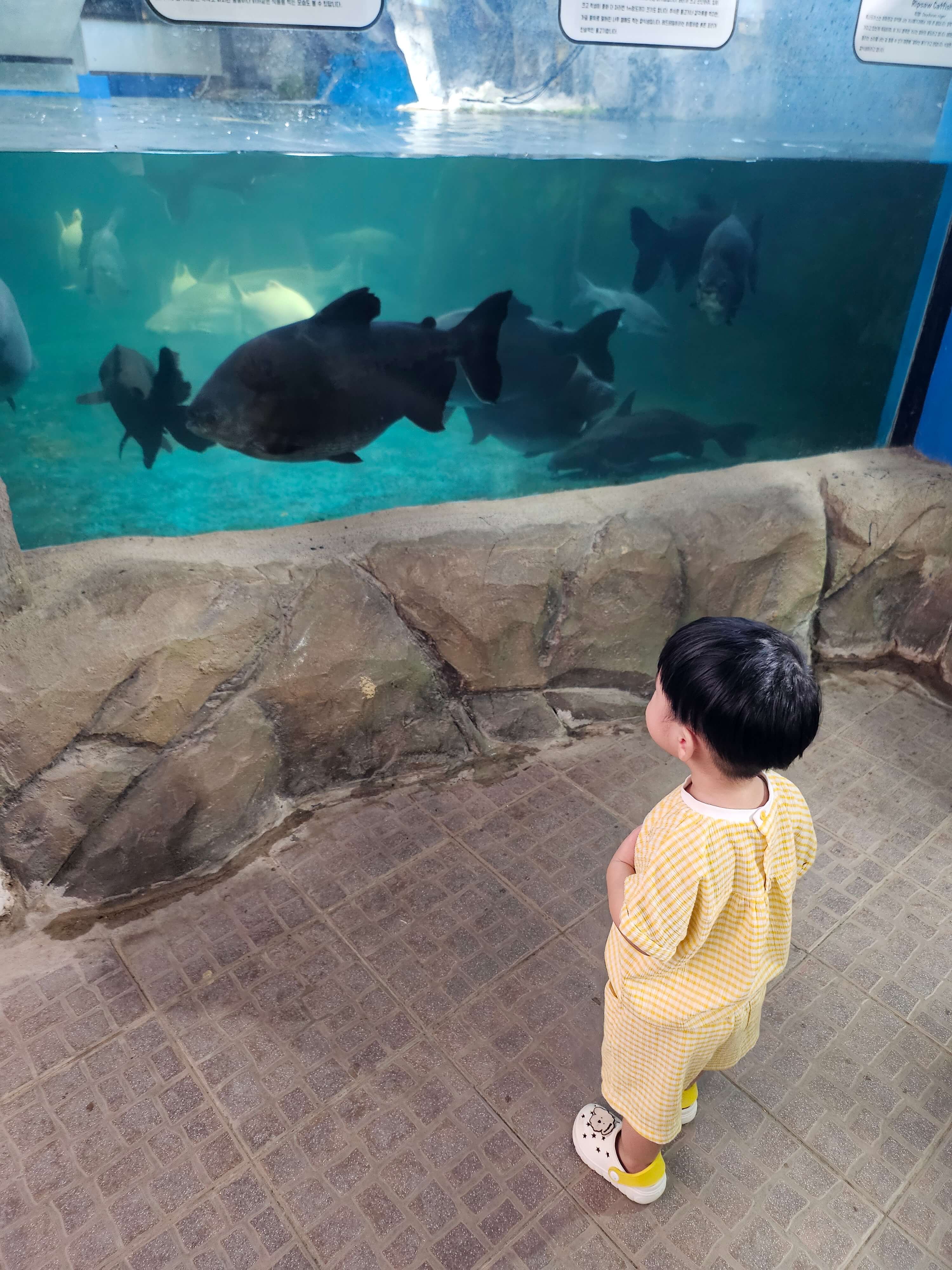 큰 물고기를 보고 무서운지 또 엄마 다리 사이로 쏙!
