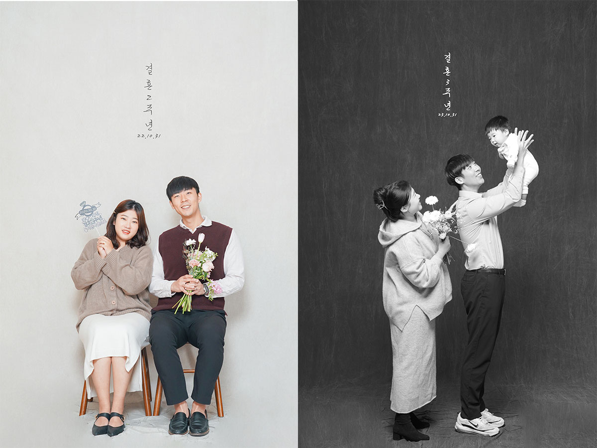 첫 번째 사진과 약간 달라진 3주년 사진입니다. 저는 인스타 피드를 흑백-컬러-흑백-컬러 이런 식으로 쌓아갈 예정이라 2주년에는 컬러사진으로 찍었습니다. 그리고 2주년부터 아꼬와 함께 사진을 찍기 시작했습니다. 왼쪽 사진에 뱃속의 아꼬는 5개월 정도 되었습니다. 1주년 사진 찍을 때만 해도 내년 사진에 아꼬가 있을 거라고는 전혀 생각하지 못했는데, 이렇게 뱃속에서 함께 사진을 찍게 됐습니다. 이런 스토리가 사진에 함께 담기니 정말 좋은 것 같습니다. 3주년 사진의 아꼬는 5개월입니다. 4주년 사진의 아꼬는 1년 5개월일 것을 생각해 보니 벌써 즐겁습니다. 아직 세장 밖에 모으지 못했지만 앞으로 또 어떤 이야기가 담긴 사진들이 쌓여갈지 기대됩니다. 사진관 추천을 하다가 갑자기 감상에 젖었습니다.
