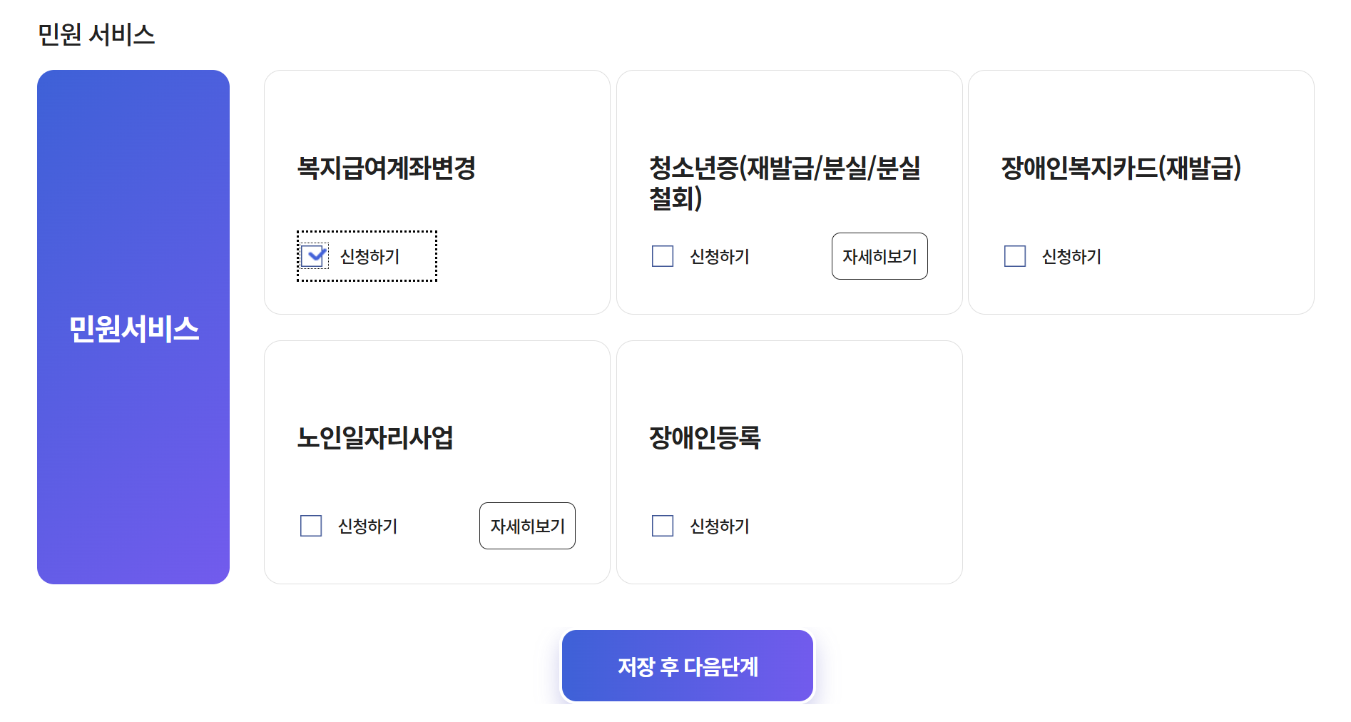 3. 민원서비스에서 복지급여계좌변경 체크 후 저장 후 다음 단계 클릭
