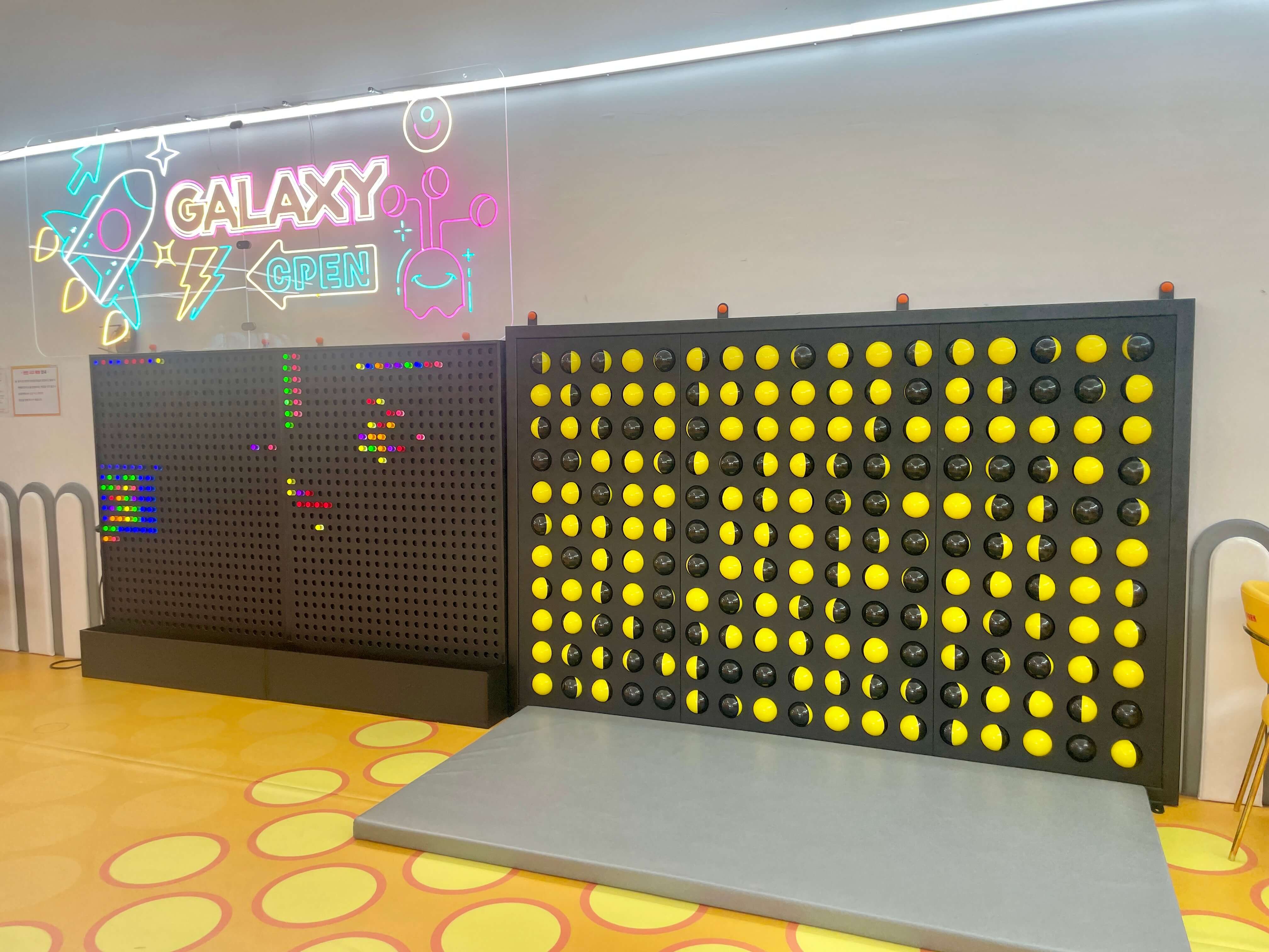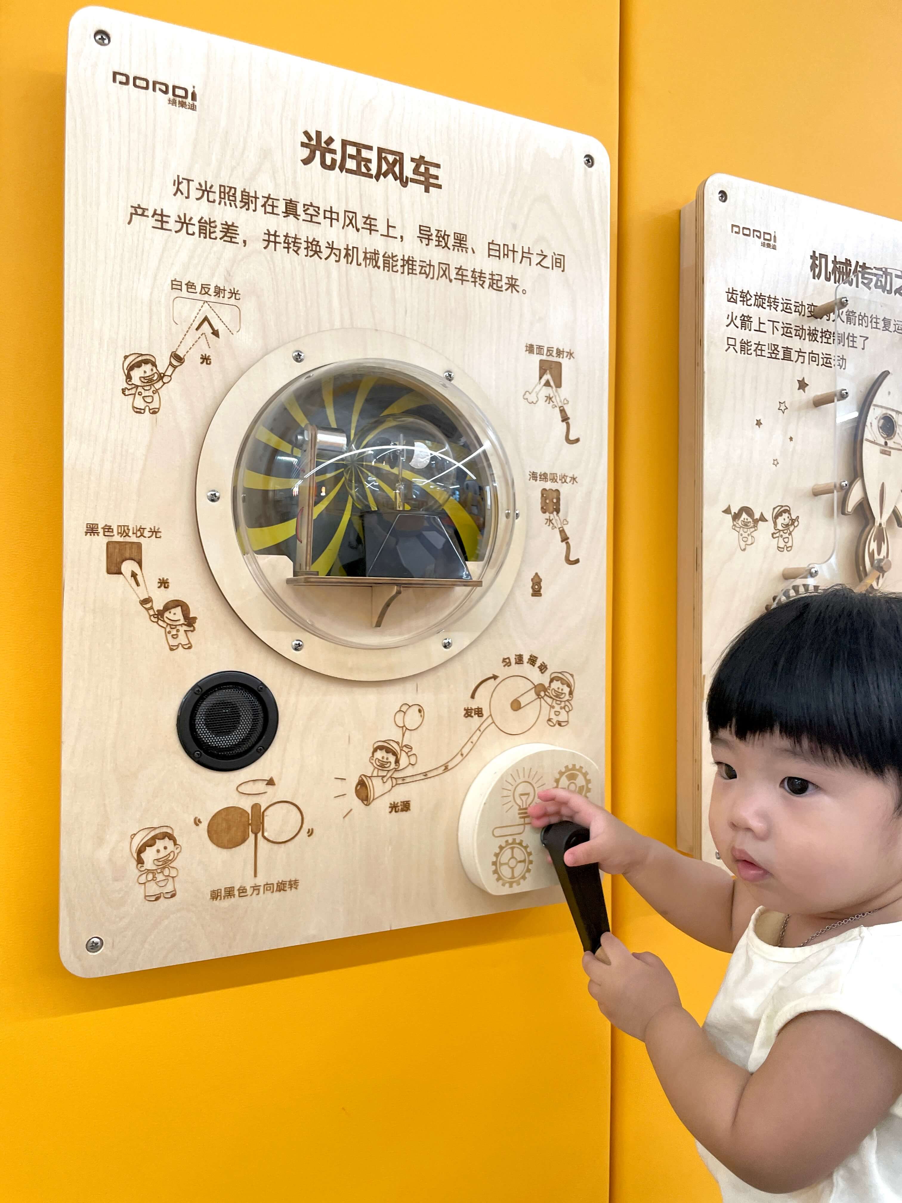 벽면에는 손으로 가지고 놀 수 있는 다양한 장치들이 있다.