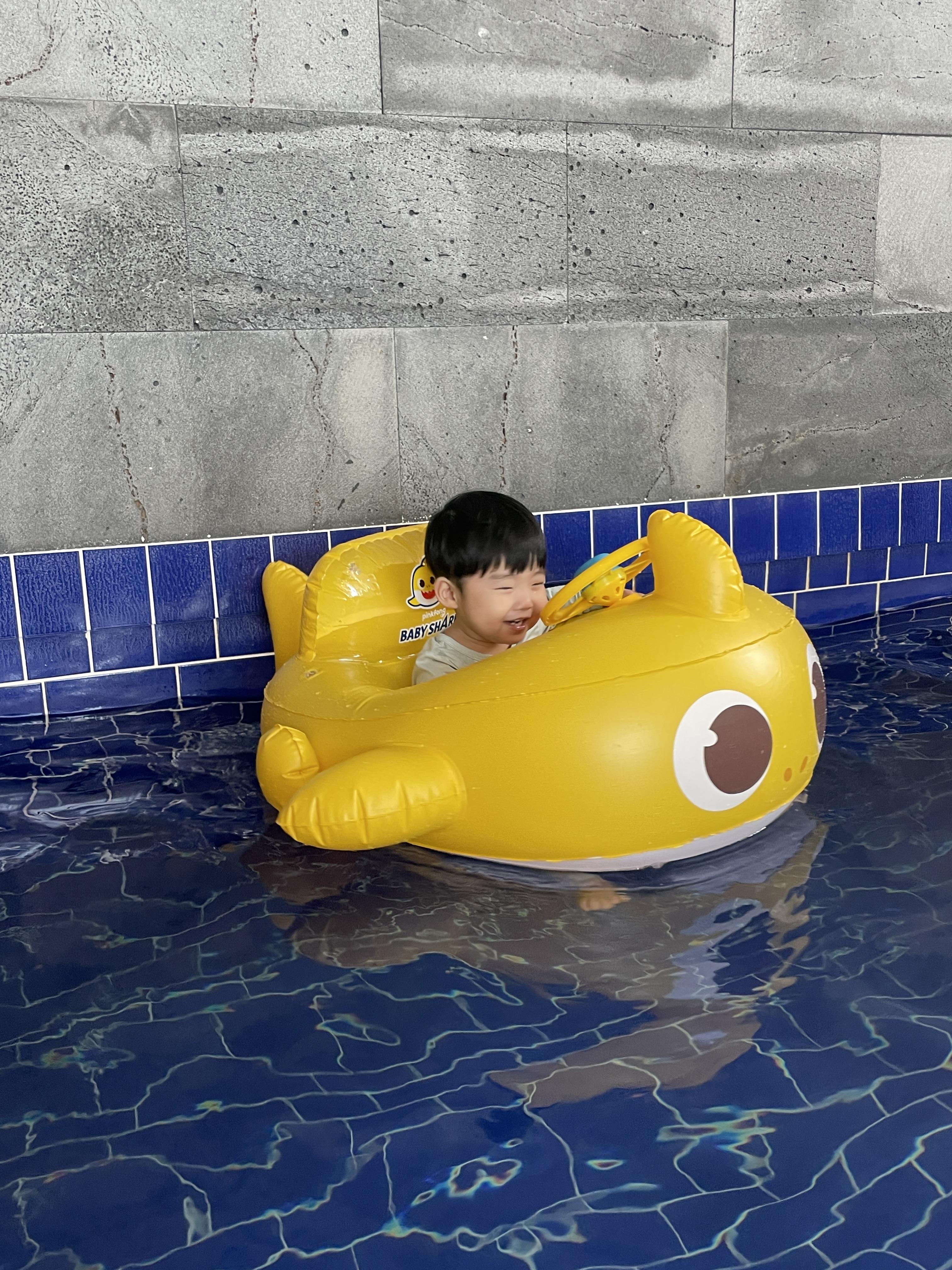 통창 반대쪽에는  24시간 온수풀이 있었습니다. 아기와 여행에서 가장 중요한 것은 안전과 편안함이었는데, 온수풀 덕분에 언제든지 따뜻한 물에서 놀 수 있어 좋았습니다. 아 꼬 는 처음 접하는 풀장에서 물장구를 치며 즐거워했고, 그 모습을 보며 흐뭇한 시간을 보냈습니다. 밤에도 따뜻한 물에 몸을 담글 수 있어서 추위를 걱정하지 않고 마음껏 물놀이를 즐길 수 있었습니다.